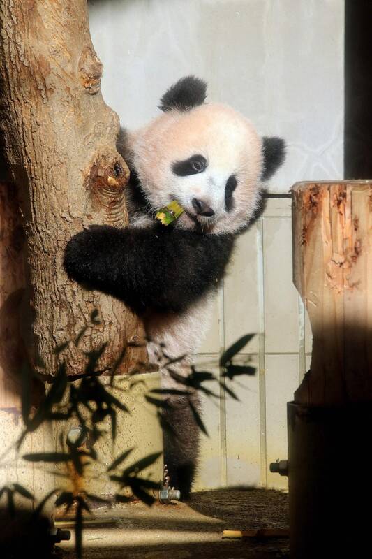 Televizijos tiesiogiai transliavo, kaip jauniklis mikliai ropščiasi į medį ir specialiame narve triauškia bambukus.