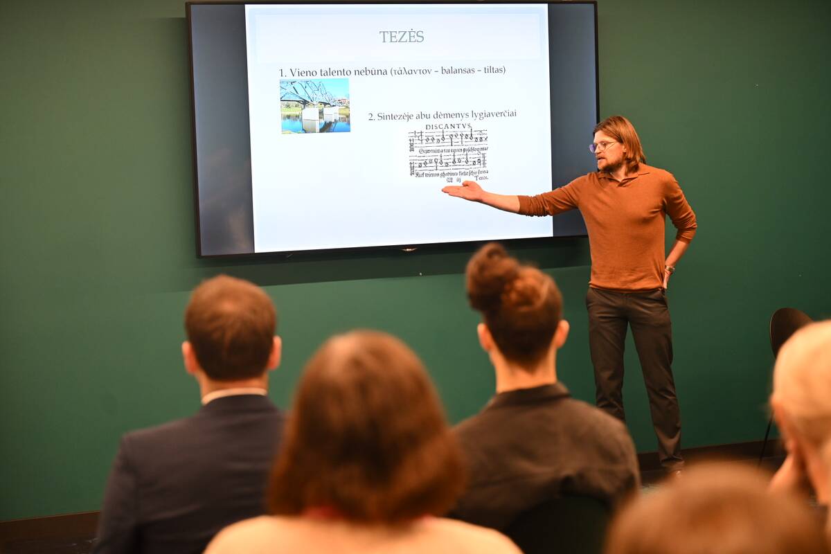 VU Matematikos ir informatikos fakulteto mokslininkas dr. Giedrius Alkauskas, savo darbe apjungiantis matematiką ir muziką, pranešime „Mokslo–meno sintezė ar lydinys? Multidisciplinijos galimybės ir pavojai“ aptarė skirtingų mokslo disciplinų apjungimo principus. Jis pabrėžė, kad vieno talento neužtenka – likdamas vienoje disciplinoje mokslininkas negali aprėpti visos tiriamo reiškinio įvairovės. Pasak pranešėjo, tik lygiaverčiai derinamos mokslo sritys leidžia sukurti tikrą tarpdisciplininį sintezės rezultatą, o procesui būtinas mokslinis sąžiningumas. G. Alkauskas atkreipė dėmesį ir į tai, kad tarpdisciplininis bendradarbiavimas atveria naujas pažinimo galimybes, tačiau reikalauja atsakingo metodų taikymo ir aiškaus ribų suvokimo.