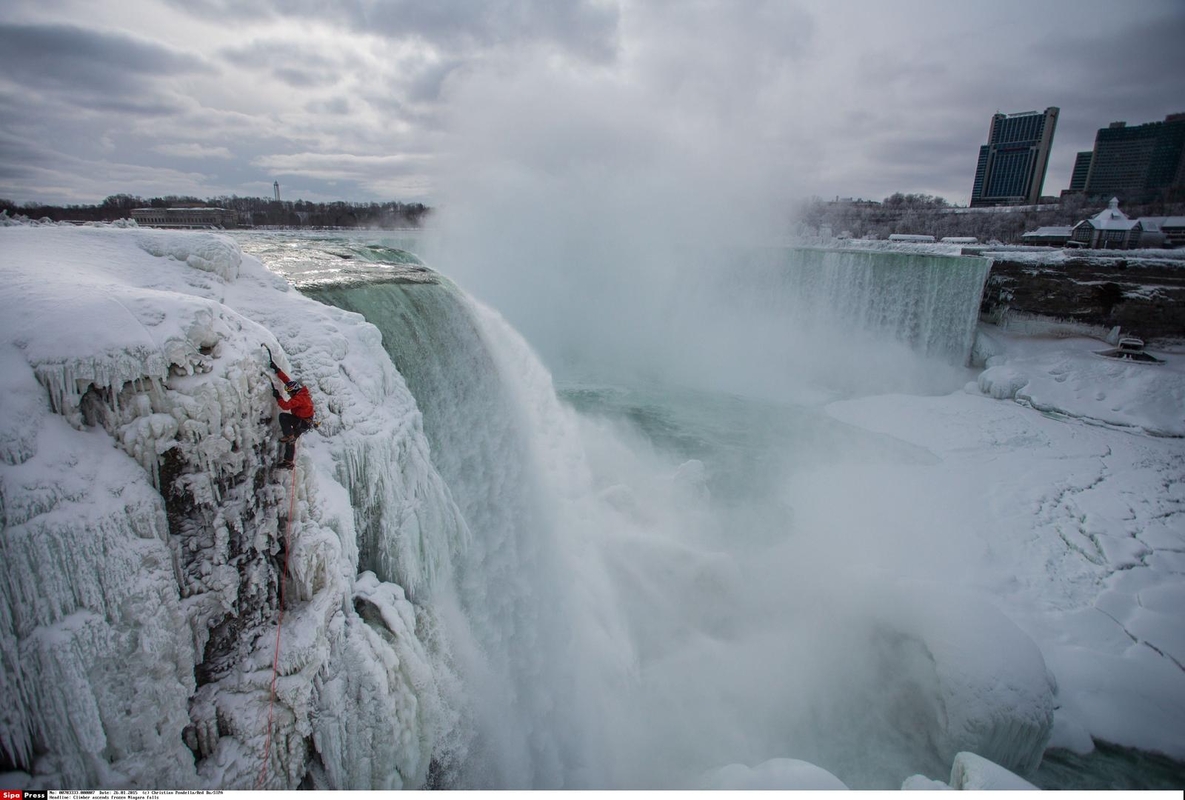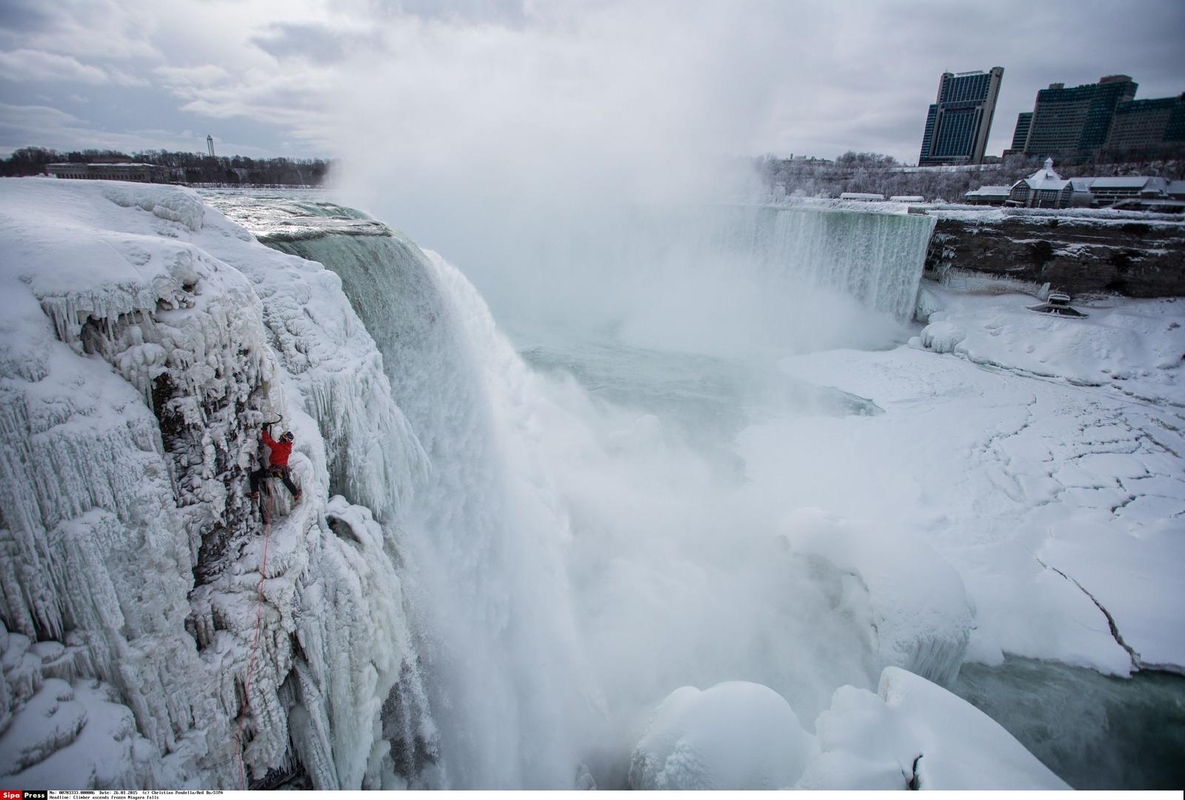 Alpinistas ledo siena aukštyn kopė, nors vos už kelių metrų žemyn leidosi žemę drebinančios Niagaros kaskados. Per minutę čia maždaug 100 km/val. greičiu nugarma apie 150 tūkst. tonų vandens. Kai tokia masė pasiekia žemę, ji sudreba taip, lyg ant jos būtų nukritę 4 tūkst. pakrautų vilkikų.