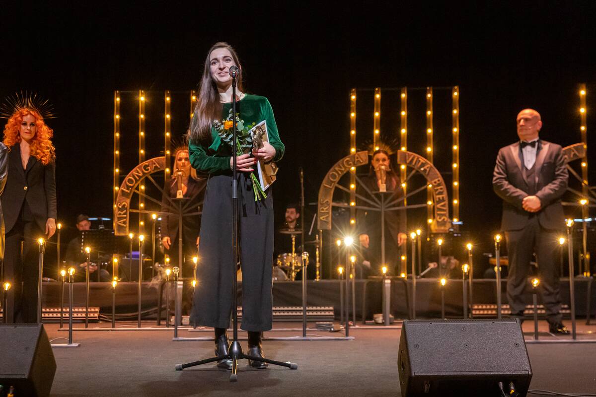 Boriso Dauguviečio auskaras už naujų sceninės išraiškos formų paieškas įteiktas „Operomanijos“ prodiuserei Anai Ablamonovai.