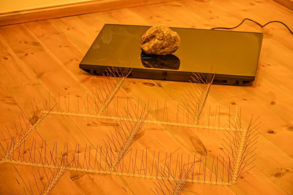 „Muitinės“ erdvė itin palanki tokiam renginiui: pagrindinė, gana didelė, sienų pertvaromis segmentuota salė ir du mažesni kambariai. Viename jų – Antti Turkko ready made skulptūra: VDA parodų stovas, su per vieną iš plakatui įtvirtinti skirtų skylių perjuosta plastikine žarna. Sąveika tarp neapibrėžtumo ir tikslumo: stendas – labai konkretus, tačiau tuščias daiktas, tad sąmonė, suprantanti jo paskirtį – komunikuoti, – kuria menamas balto plakato žinutes.