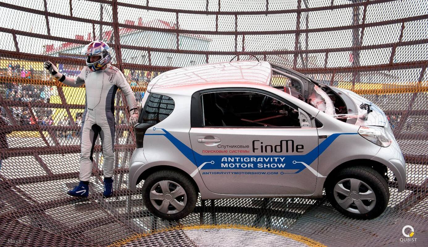 Tarptautinio kaskadininkų šou „Skraidantys automobiliai – Double Twist” metu du automobiliai važinėja gigantiškoje 12 metrų skersmens metalinėje sferoje, jos dydis prilygsta 4 aukštų namui. Programoje pristatomi šuoliai nuo tramplinų motociklu ir automobiliu, apsivertimai, sprogimai, akrobatiniai triukai. Kvapą gniaužiančios programos kulminacija – sinchroniškas dviejų automobilių dvigubas apsisukimas ore.