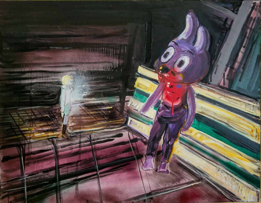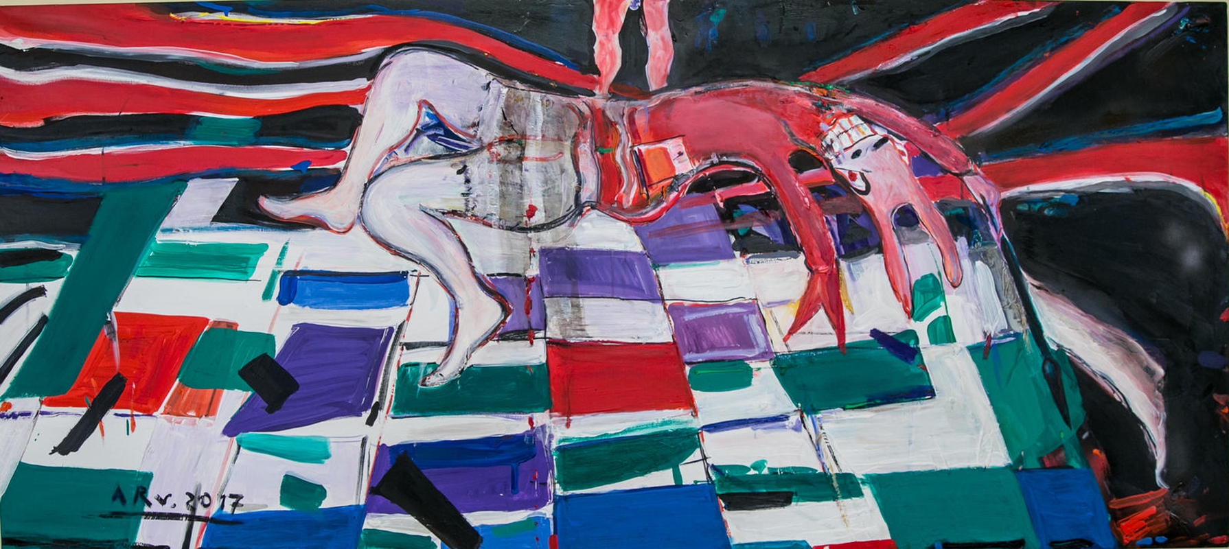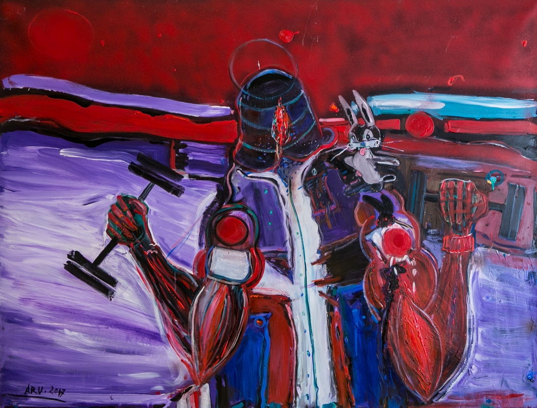 – Galima ir taip teigti. Viename Raudonkepuraitės ciklo paveiksle vilkas patapo mano darbuose dažnai regimu zuikiu. Grėsmingas gyvūnas taip įgavo šiek tiek švelnumo. Kitos serijos paveiksle zuikis sėdi šiurpiam monstrui ant peties, taip iš dalies nuslopindamas jo baisumą. Apskritai, zuikis – raminantis personažas, kuris sušvelnina visą paveikslo ekspresiją ir gaivališkumą, žmogui tampa maloniau į jį žiūrėti. Šis veikėjas neretai apsigyvena ir tapytojos Aušros Barzdukaitės-Vaitkūnienės darbuose. Vis pajuokaujame, kad mūsų zuikiai turi visai kitokią prasmę. Mano – žaismingi, kartais netgi erotiški. O Aušra savo zuikių prasmės taip ir neišduoda, bet geriau tegul tai ir lieka paslaptis.