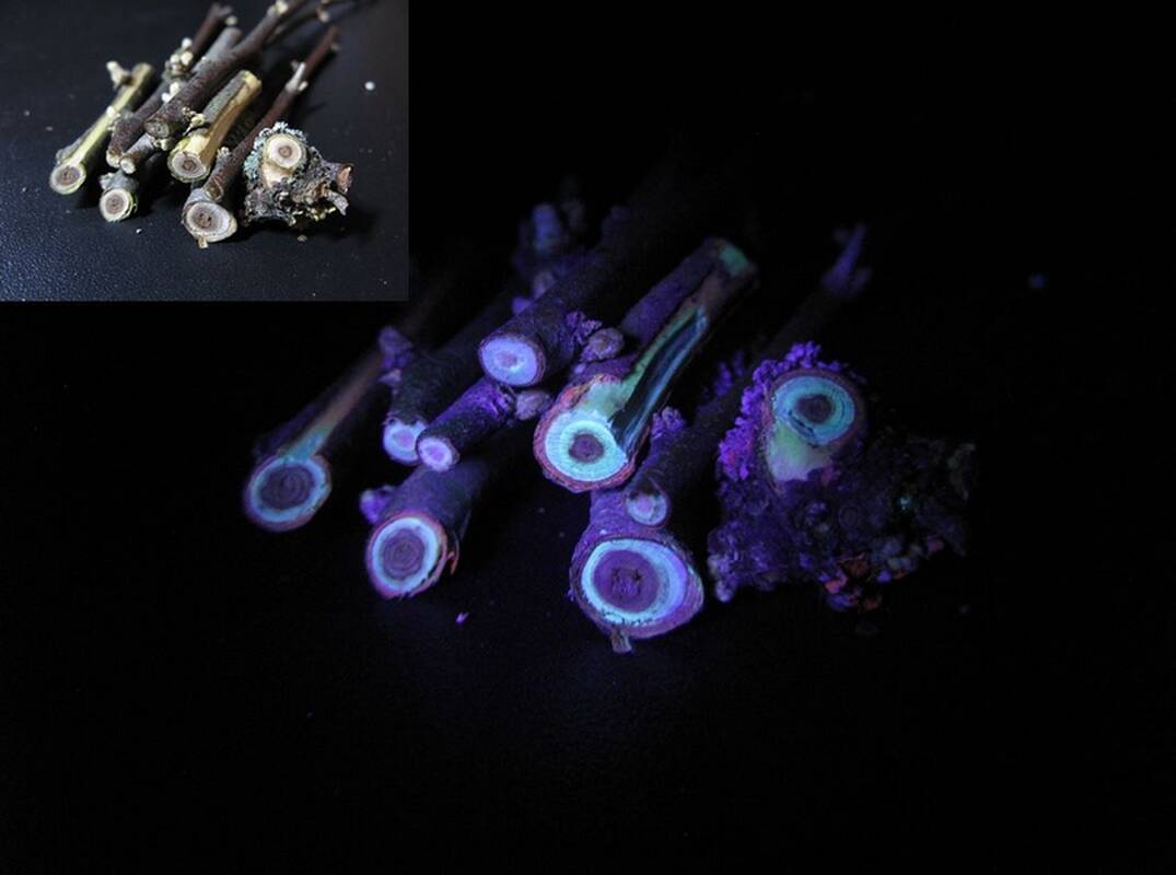 Kai kurių sumedėjusių augalų mediena ultravioletinėje šviesoje švyti geltona, žalia, oranžine, rausva ar melsva spalva. „Medžiui bręstant ir senstant, šerdies zonoje kaupiasi ypač daug fenolinių junginių (rūgščiojo žagrenio šioje medienos zonoje randama daug įvairių taninų ir flavonoidų, o su amžiumi jų koncentracija didėja). Baltažiedės robinijos šerdies medienoje rasta 41 skirtingų flavonoidų, bet yra duomenų, kad švytėjimą pagrinde lemia robinetino koncentracija“, – teigė dr. A. Malakauskienė.
