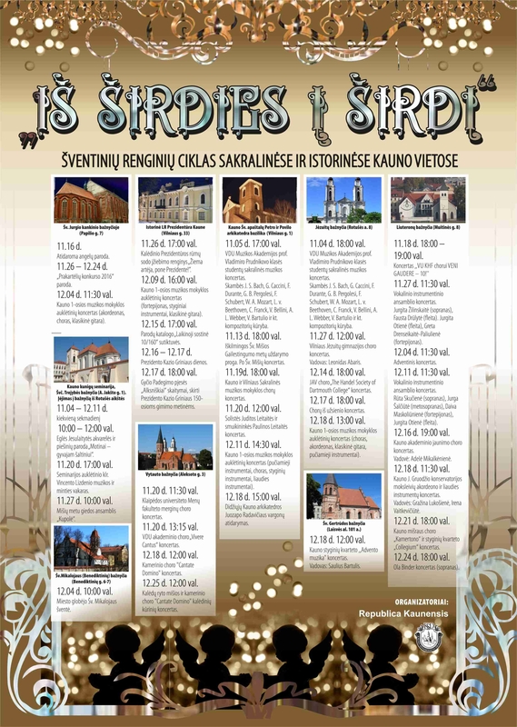 Nemokamų renginių ciklo „Iš širdies į širdį“ koncertai ir parodos vyks Šv. Jurginio kankinio bažnyčioje, Kauno kunigų seminarijos Švč. Trejybės bažnyčioje, Šv. Mikalojaus (benediktinių) bažnyčioje, Istorinėje LR prezidentūroje Kaune, Vytauto bažnyčioje, Kauno Šv. Apaštalų Petro ir Povilo arkikatedroje bazilikoje, Jėzuitų bažnyčioje, Šv. Gertrūdos bažnyčioje ir Liuteronų bažnyčioje.