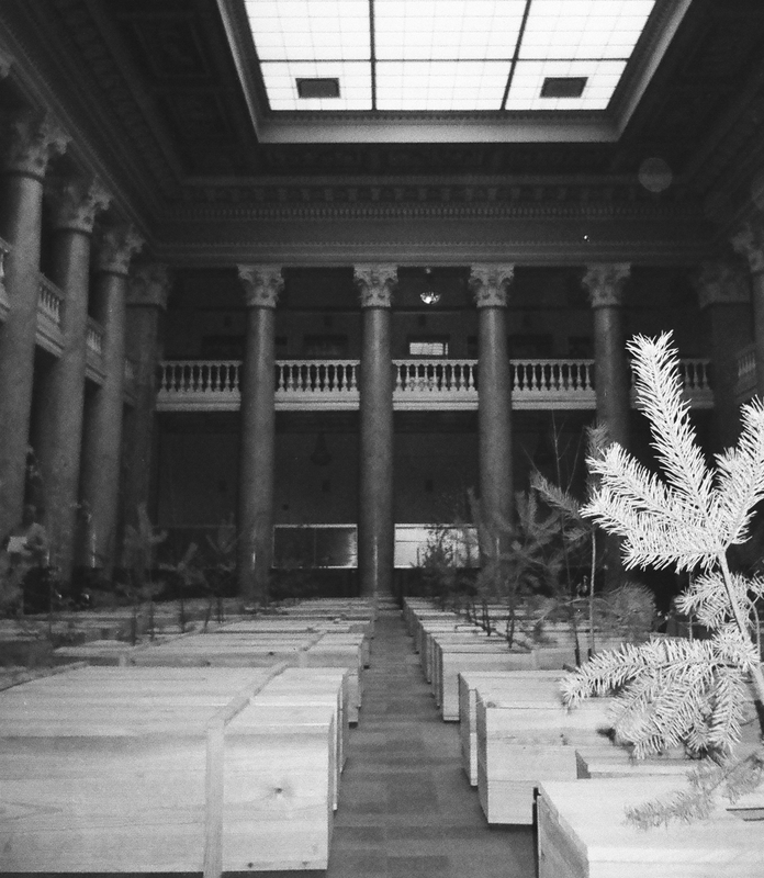 Per du aukštus ištįsusios stambios kolonos suskamba su mažučiais medžiais, kurie dar tik bando pasiekti pastato lubas, pavyti kolonas. Medžiai ir kolonos siejamos su dangišku vertikalumu, dieviškumu, tačiau priverčia susimastyti ir apie skirtingą patalpoje esančių daiktų kilmę: vieną gali sukurti žmogus, kitą – gamta.