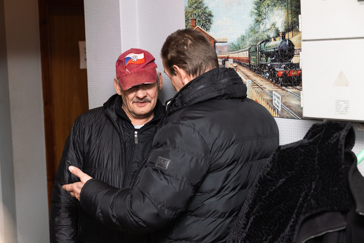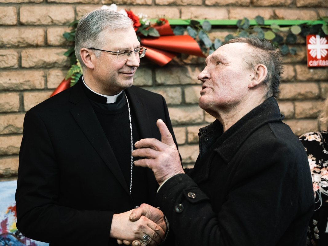 Prašymas: į benamystę ir vienišumą patiriančių žmonių dienos centrą „Ateik“ užsukęs lankytojas paprašė arkivyskupo K. Kėvalo palaiminimo. / Edgaro Cickevičiaus nuotr.