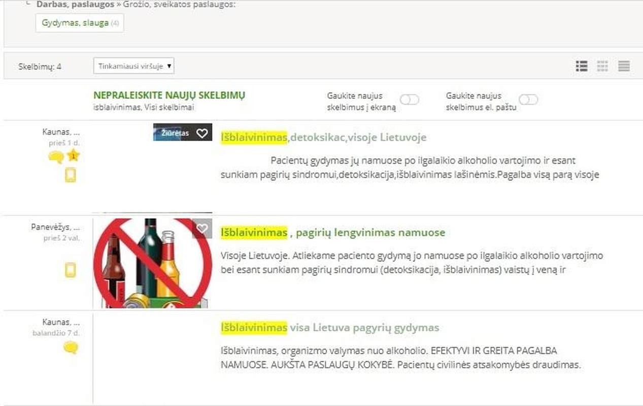 Viename populiariame skelbimų portale radome kelis skelbimus, įdėtus prieš kelias dienas. Dviejuose skelbimuose nurodyta, kad jis įdėtas iš Kauno, tačiau tekste nurodoma, kad išblaivinimo paslauga teikiama visoje Lietuvoje. Dar vienas skelbimas nurodė, kad tokia paslauga teikiama Panevėžyje.