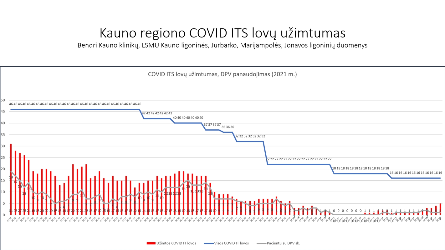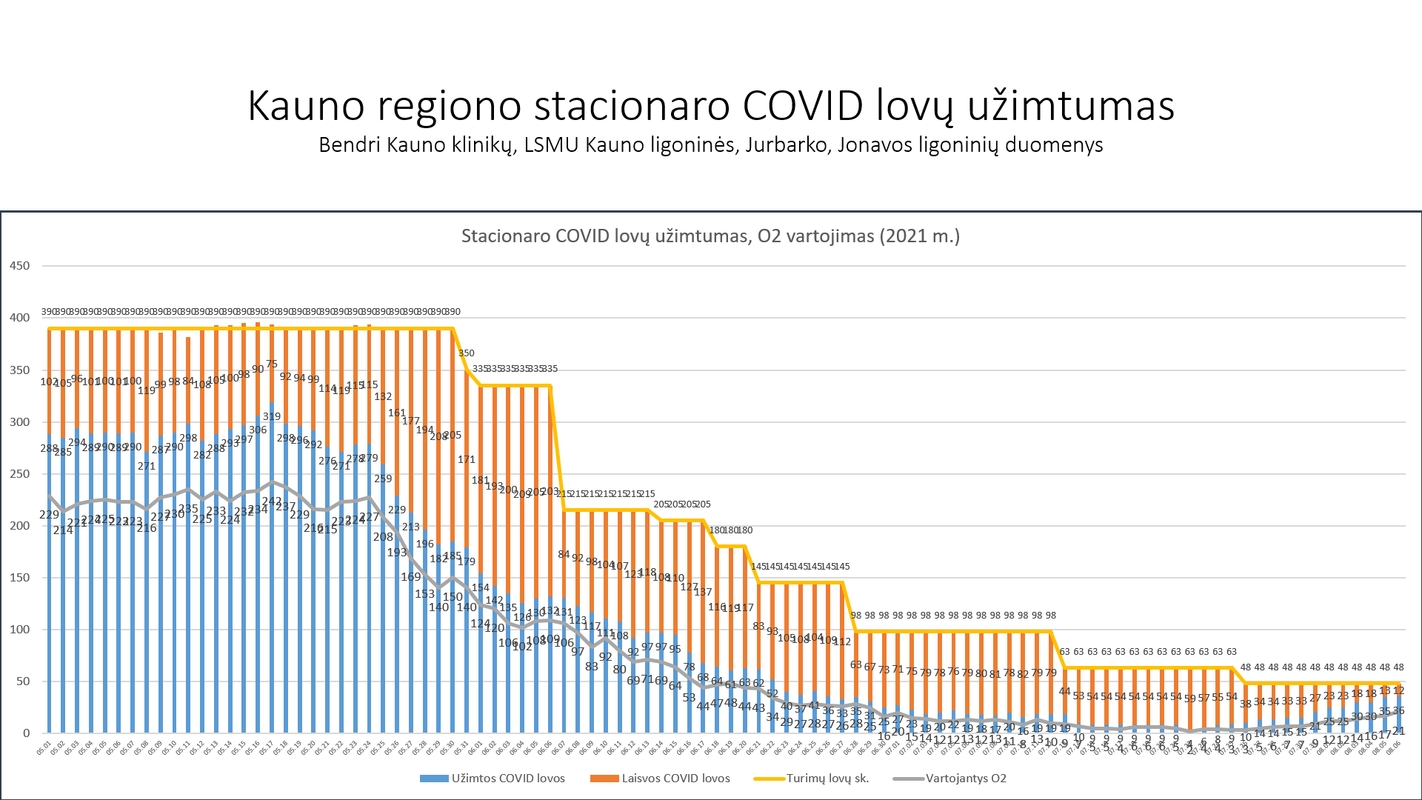 Šiuo metu Kauno regiono ligoninėse esančių stacionaro lovų su deguonies tiekimu užimtumas siekia 75 proc. (užimtos 36 iš 48 lovų). Reanimacijos ir intensyviosios terapijos – 31 proc. (užimtos 5 lovos iš 16).