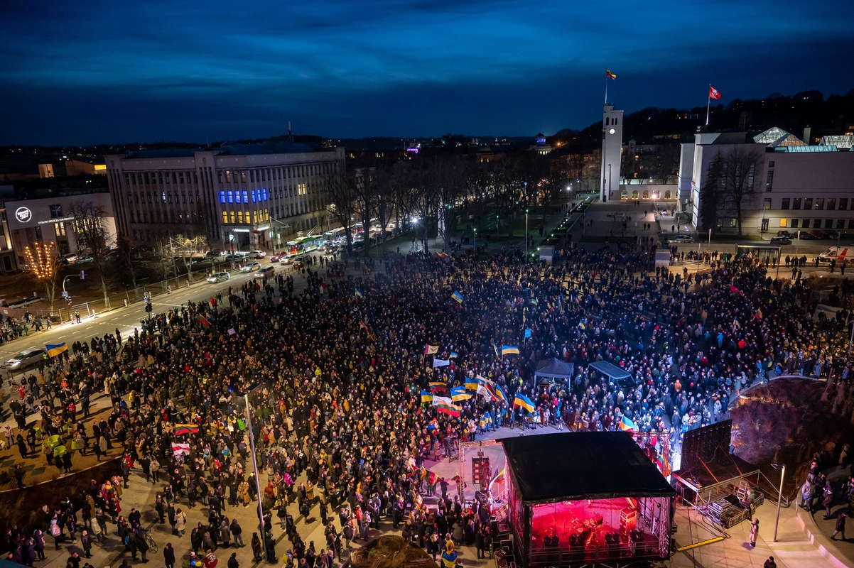 Kaip ir prieš metus, vakarop kauniečiai kviečiami susiburti Vienybės aikštėje. Nuo 18.30 val. studentija drauge su verslo bendruomene organizuoja palaikymo akciją „Laisvė šviečia“. Susirinkusieji raginami pasipuošti Lietuvos ir Ukrainos vėliavomis, atsinešti žvakelių ir žibintuvėlių švieselių jūrai įžiebti.