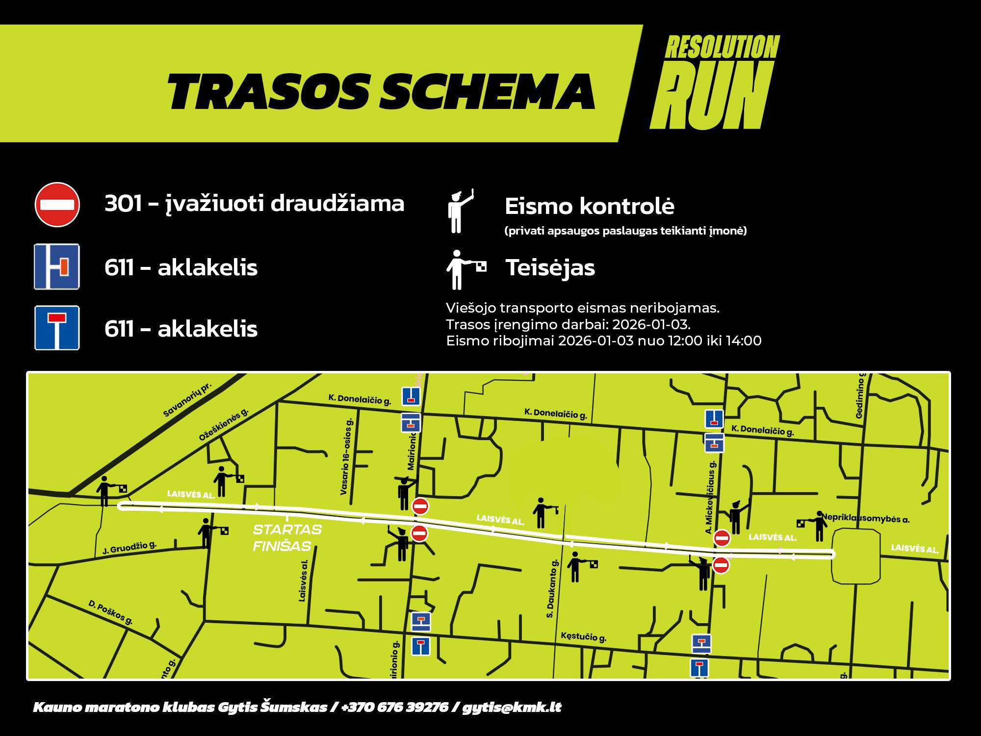 „Šeštadienį, sausio 3 d., dėl bėgimo „Resolution Run“ nuo 12 iki 14 val. bus ribojamas eismas Laisvės alėją kertančiose Maironio ir A. Mickevičiaus gatvių atkarpose. Atsiprašome už nepatogumus“, – informavo Kauno miesto savivaldybės specialistai.