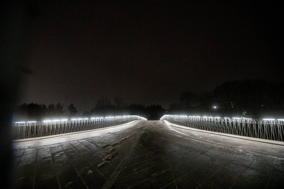 Kauniečiai pastebėjo, kad Kauno centrą ir Nemuno salą jungiantis naujasis pėsčiųjų tiltas vakarais jau apšviestas LED lemputėmis. Nebėra ir darbininkų, kurie dailintų paskutinius tilto akcentus.