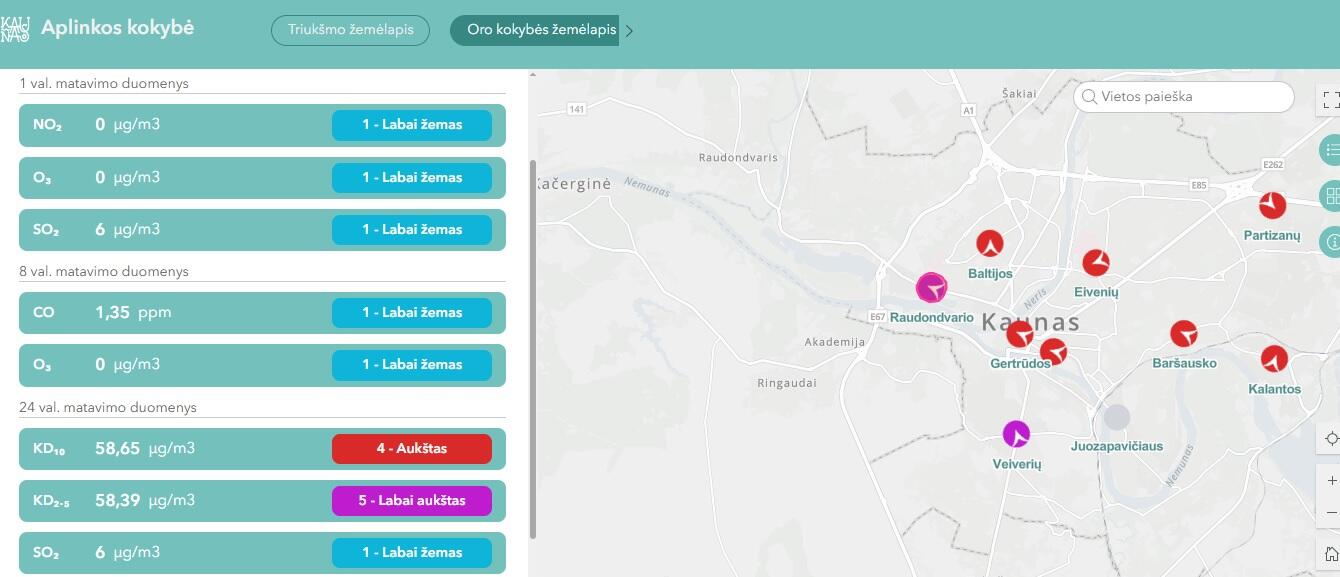 Kauno miesto savivaldybės oro kokybės žemėlapyje matyti, kad kietųjų dalelių koncentracija padidėjusi visose matuojamose vietose. Specialūs oro taršos matuokliai įrengti visuose miegamuosiuose rajonuose, tad galima realiu laiku stebėti, kaip keičiasi oro kokybė.