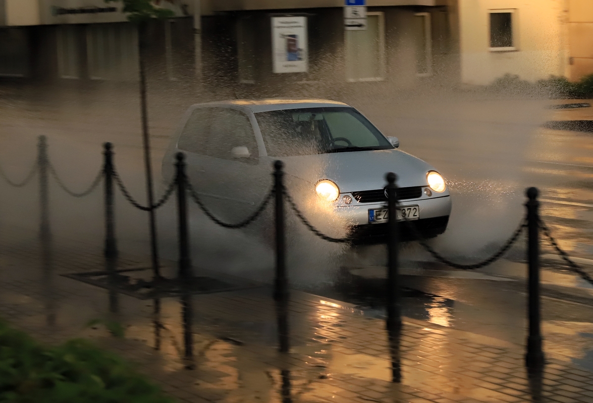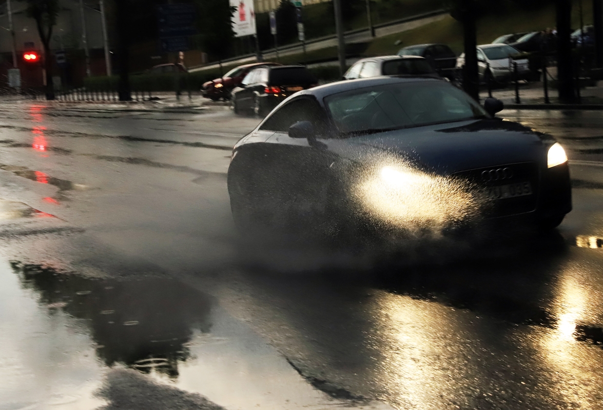 Kauno dangų skrodė žaibai ir perkūnija, smarkus lietus skandino Laisvės alėją.