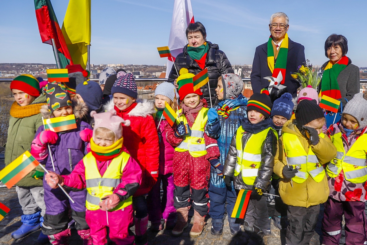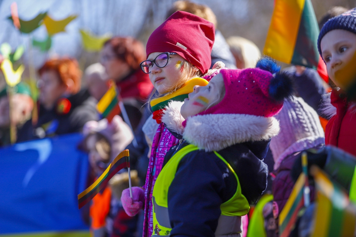 Lietuvos himną šiandien giedojo tūkstančiai šventiniais akcentais pasipuošusių Kauno mokyklų mokinių, susibūrusių Aleksoto apžvalgos, Milikonių, Pelėdų kalno, Paminklinės Kristaus prisikėlimo bažnyčios apžvalgos aikštelėse, ant Savanorių pr. kalno, kitose Kauno vietose.