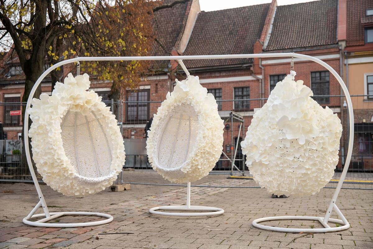 Šįkart Rotušės aikštėje tekstilininkė Jolanta Šmidtienė sukūrė saldžias saldžias Kalėdas. Eglę ji papuošė tarsi morenginiais debesimis, o aikštėje „bėgiojo“ tarsi morenginių avinėlių figūros.