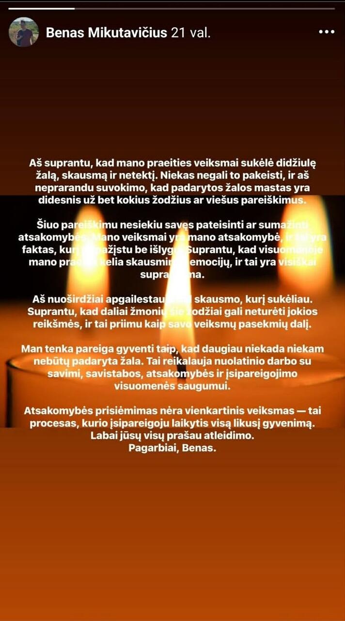 Žinutė su fiksuotu feisbuko istorijos ekrano vaizdu portalą kauno.diena.lt pasiekė pirmadienio vakarą. „Nežinau, ar aktualu jums, ar ne, bet pamačiau, kad Benas Mikutavičius įkėlė į savo „Facebook“ istoriją atsiprašymą dėl savo padarytų veiksmų prieš 21 valandą“, – rašė informaciją atsiuntę skaitytojai.
