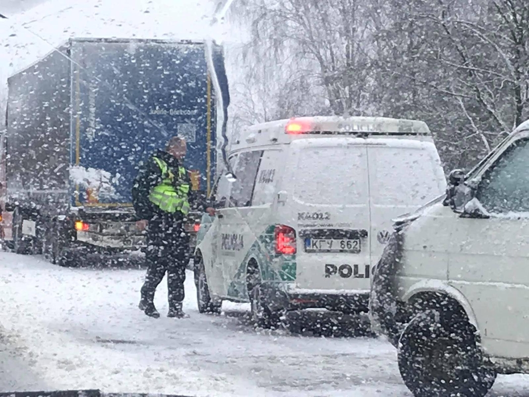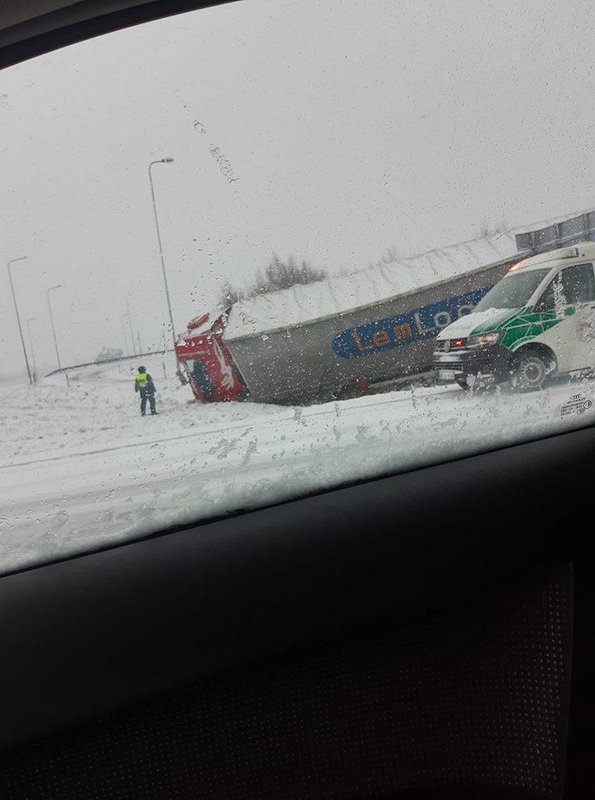 Maždaug 10.15 val. eismo nelaimė fiksuota ir ant Garliavos viaduko. Čia vilkikas dėl slidžios kelio dangos nulėkė į griovį.