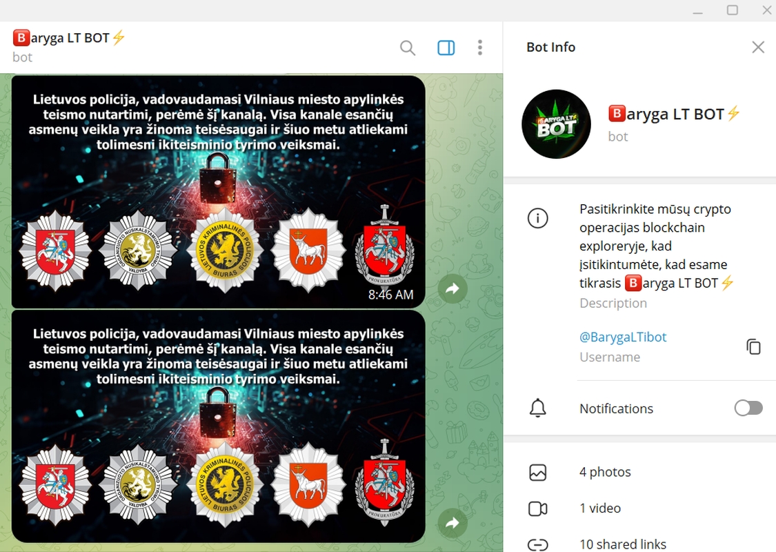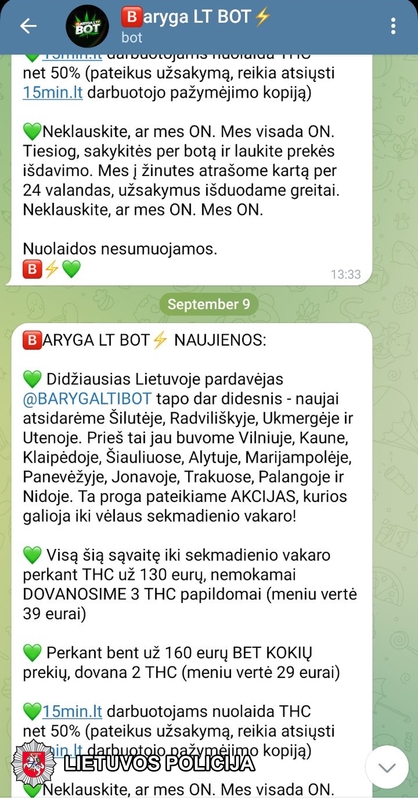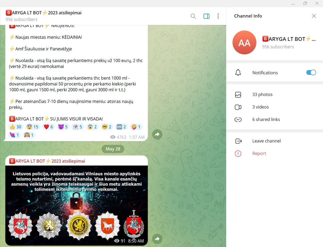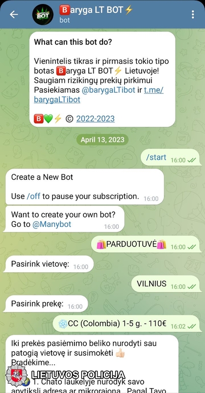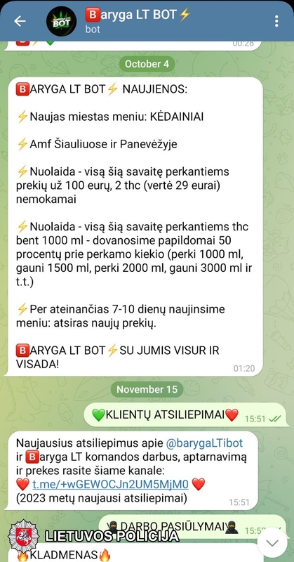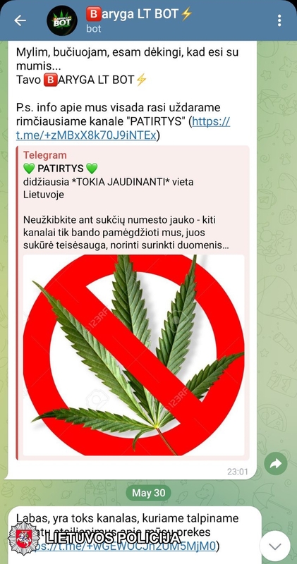 Kaip antradienį pranešė Vilniaus policija, sostinės pareigūnai kartu su Kauno kolegomis vyrą Kauno rajone sulaikė gegužės 21 dieną. Jis įtariamas internetinėje „Telegram“ programėlėje sukūręs kanalą „Baryga LT BOT“, skirtą neteisėtam įvairių rūšių narkotinių ir psichotropinių medžiagų platinimui įvairiuose Lietuvos miestuose.