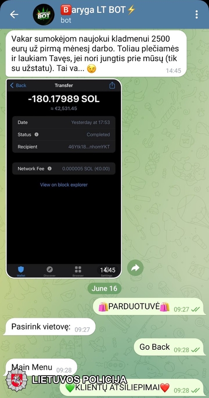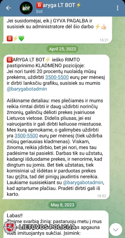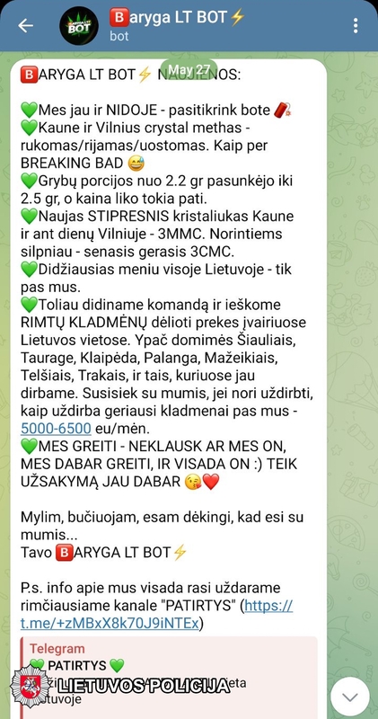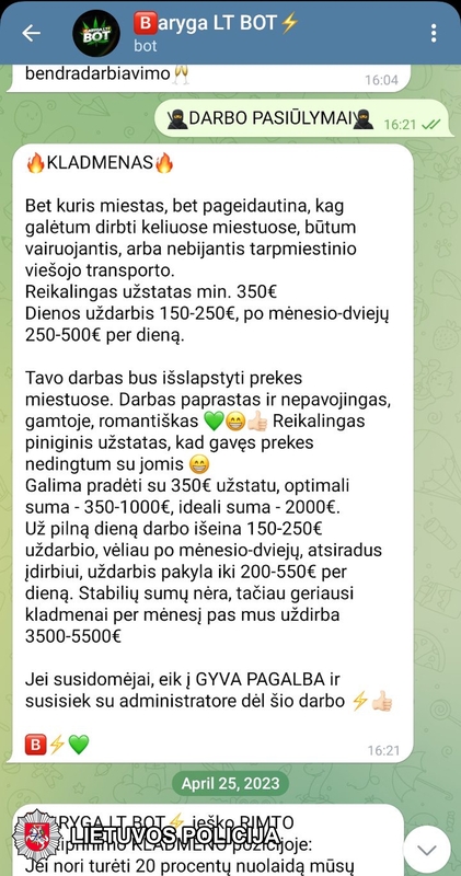 „Telegram“ kanale buvo siūloma ne tik įsigyti narkotinių ar psichotropinių medžiagų, bet ir darbas – į įvairias vietas išslapstyti narkotines medžiagas, už tai buvo siūlomas nuo 150 iki 250 eurų atlygis per dieną, o priklausomai nuo įdirbio – ir didesnis.