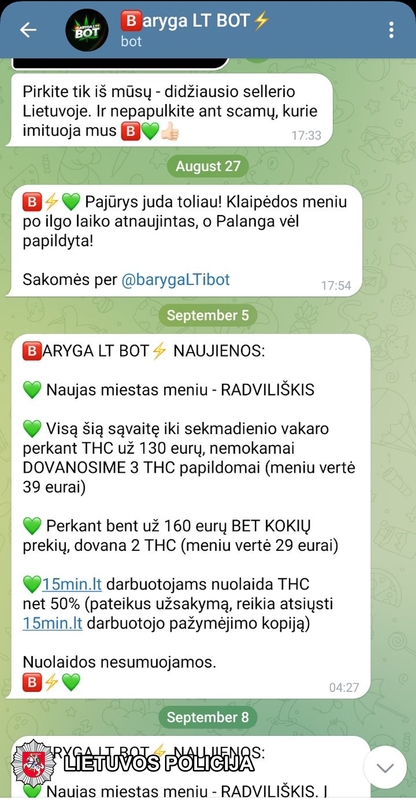 Nustatyta, kad „Telegram“ kanale „BarygaLT BOT“ ir „Miami Imperija“ esančiose grupėse įsigyti narkotinių medžiagų buvo siūloma ne tik Lietuvos didmiesčiuose: Vilniuje, Kaune, Klaipėdoje, Šiauliuose, Panevėžyje, bet ir mažesniuose miestuose bei miesteliuose: Marijampolėje, Jonavoje, Kėdainiuose, Radviliškyje, Šilutėje, Trakuose, Palangoje, Nidoje.