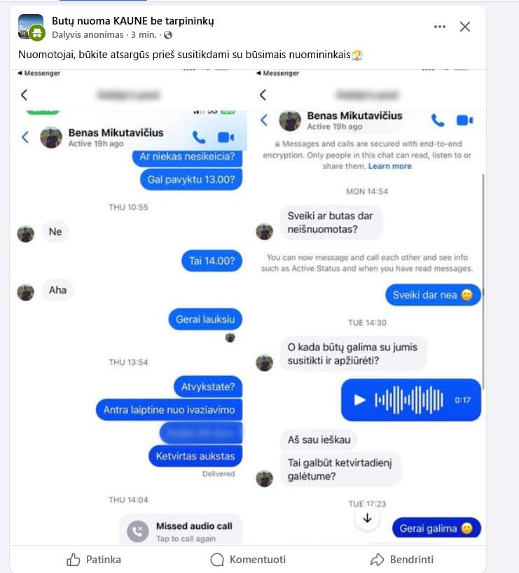 Kaunietė G. anksčiau buvo paskelbusi, kad nuomoja butą. Būtent B. Mikutavičius pagal šį skelbimą ir kreipėsi į ją. Paviešintame susirašinėjime matyti, kad pasiteiravo, ar butas dar laisvas. Į atsakymą jis nesureagavo. Mergina ėmėsi iniciatyvos ir dar kartą su juo susisiekė. Tuomet dėl buto nuomos kreipęsis asmuo paklausė, ar galėtų atvykti ketvirtadienį apžiūrėti. Pageidavo 14 val.