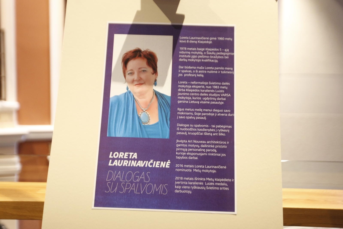 Pernai Metų klaipėdiete nominuota L.Laurinavičienė šią savo parodą skiria ir šiųmetiniam Metų klaipėdietės renginiui, kuris, kaip tik vyks šiandien, trečiadienį, Klaipėdėdos dramos teatre. Tad vakaro svečiai turės galimybę pasižiūrėti „Dialogą su spalvomis“.