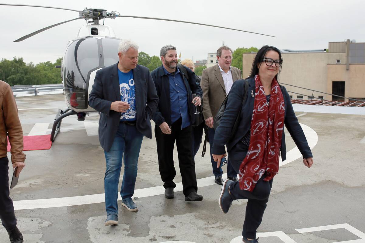 Lipančius iš lėktuvo garsius muzikantus pasitiko festivalio organizatoriai, tarp jų – miesto meras Vytautas Grubliauskas su žmona Inga Grubliauskiene.