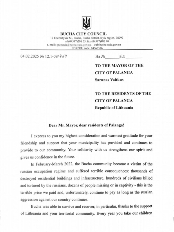 „Palanga yra vienybės ir bendruomeniškumo pavyzdys. Būtent šis susitelkimas padėjo miestui pasiekti reikšmingą sėkmę. Išlaikyti šią vienybę – svarbus žingsnis siekiant tolesnės pažangos ir atsparumo išoriniams iššūkiams“, – teigiama A. Fedoruko laiške Palangos savivaldybei ir kurorto gyventojams.