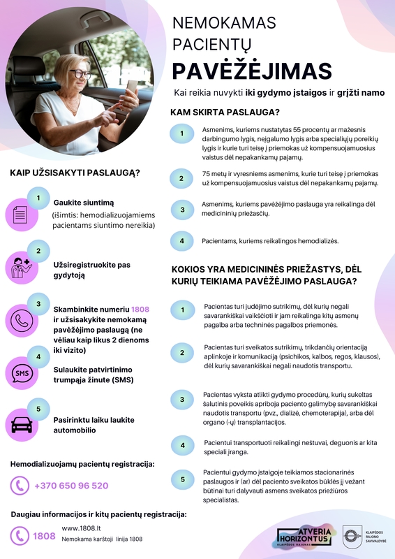 Svarbu ir tai, kad nuolatiniu grafiku pagal poreikius į gydymo įstaigą vežami ir pacientai, kuriems du tris kartus per savaitę reikalingos hemodializės procedūros. Šią paslaugą koordinuoja Klaipėdos rajono savivaldybės visuomenės sveikatos biuras. Hemodializuojami pacientai dėl nemokamo pavėžėjimo pagal jiems sudarytą pastovų grafiką gali skambinti telefono numeriu +370 650 96 520.