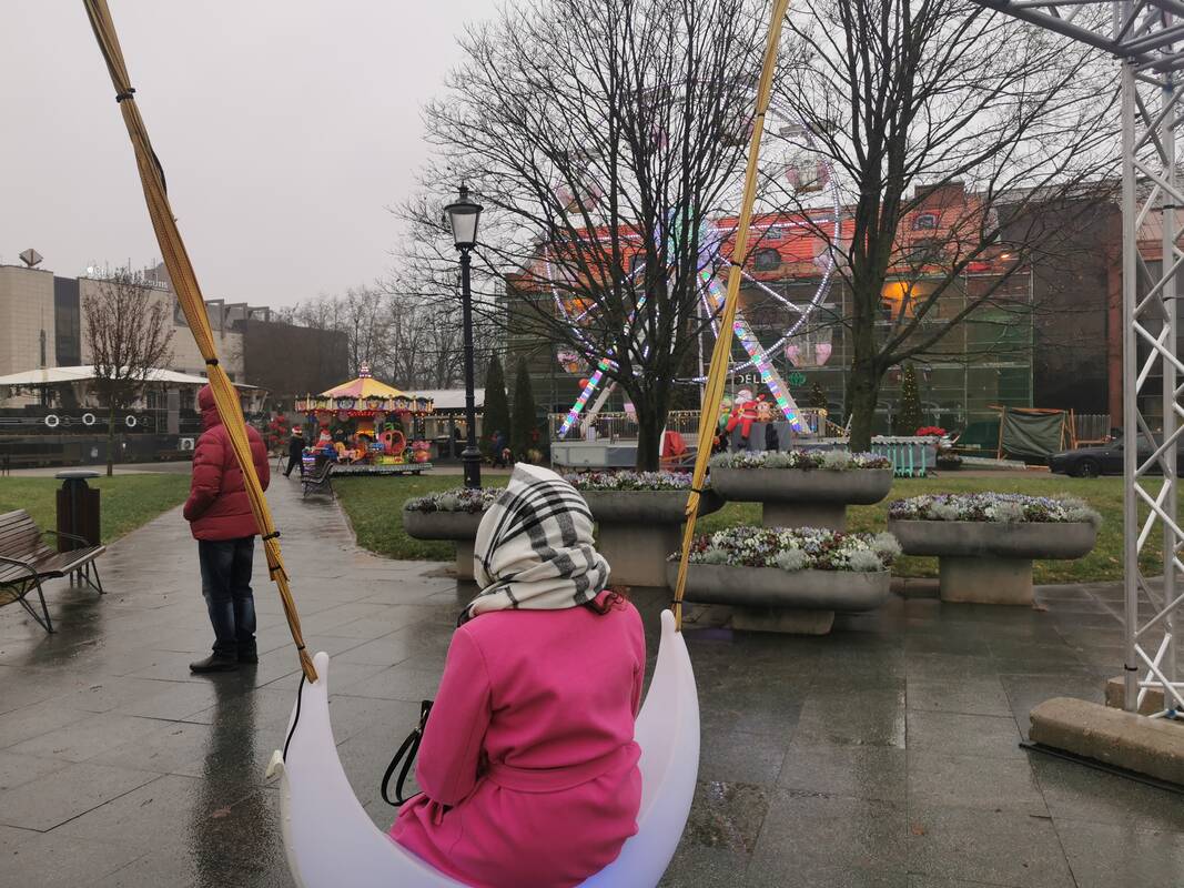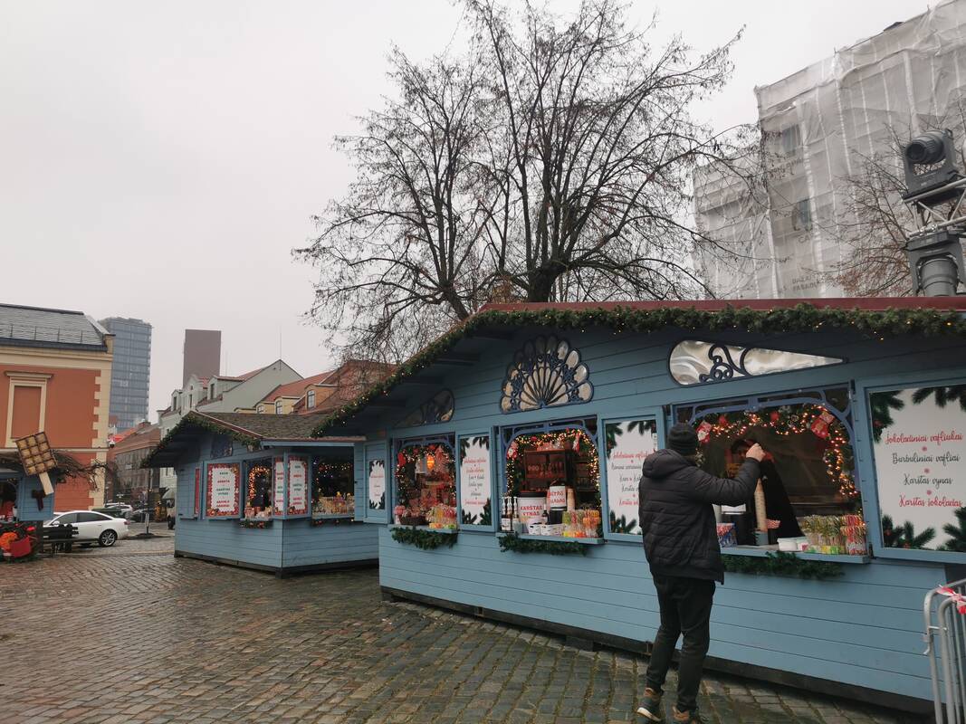 Aikštėje skamba kalėdinė muzika, o aplink alsuoja jauki atmosfera.