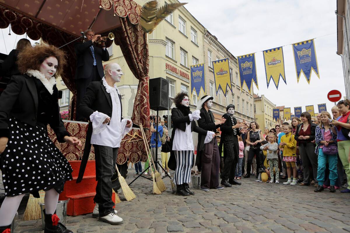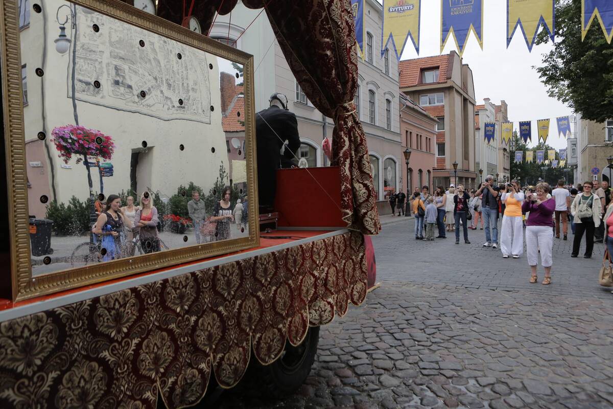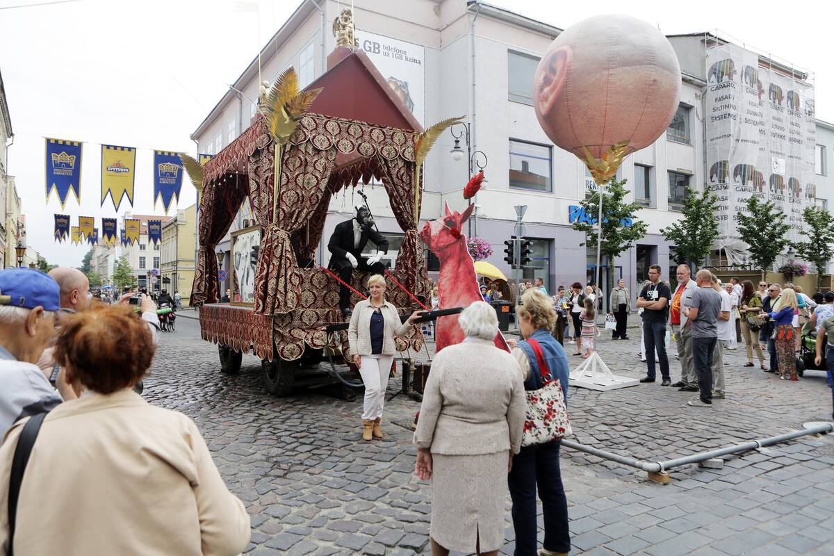 Tiltų ir Turgaus gatvių sankryžoje įsikūrusį įspūdingą meninį kūrinį pristatęs Aleksas Mažonas ir jo pantomimos teatro „A“ komanda aplink vežimą privertė susiburti minią žmonių.