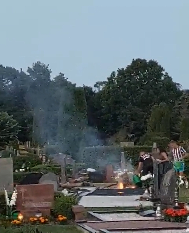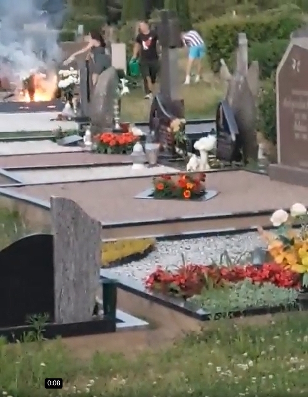 Keli vaikinai ir viena mergina supratingai nuskubėjo gesinti liepsnų, kurios siautėjo ant kapo.