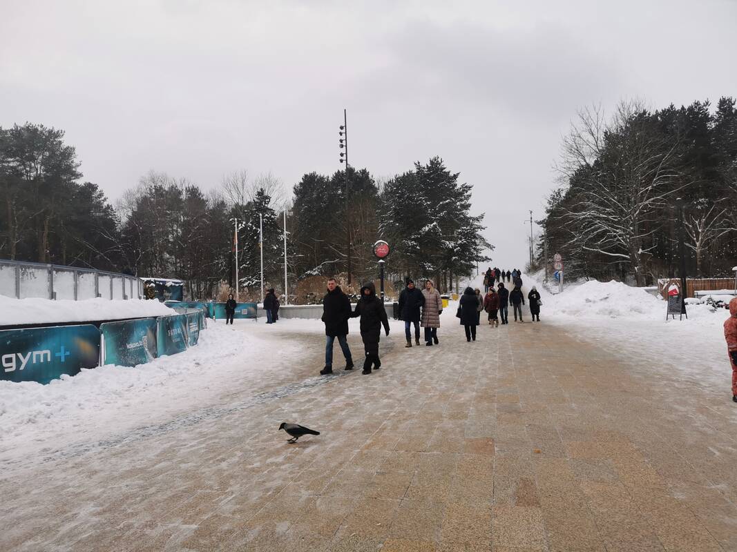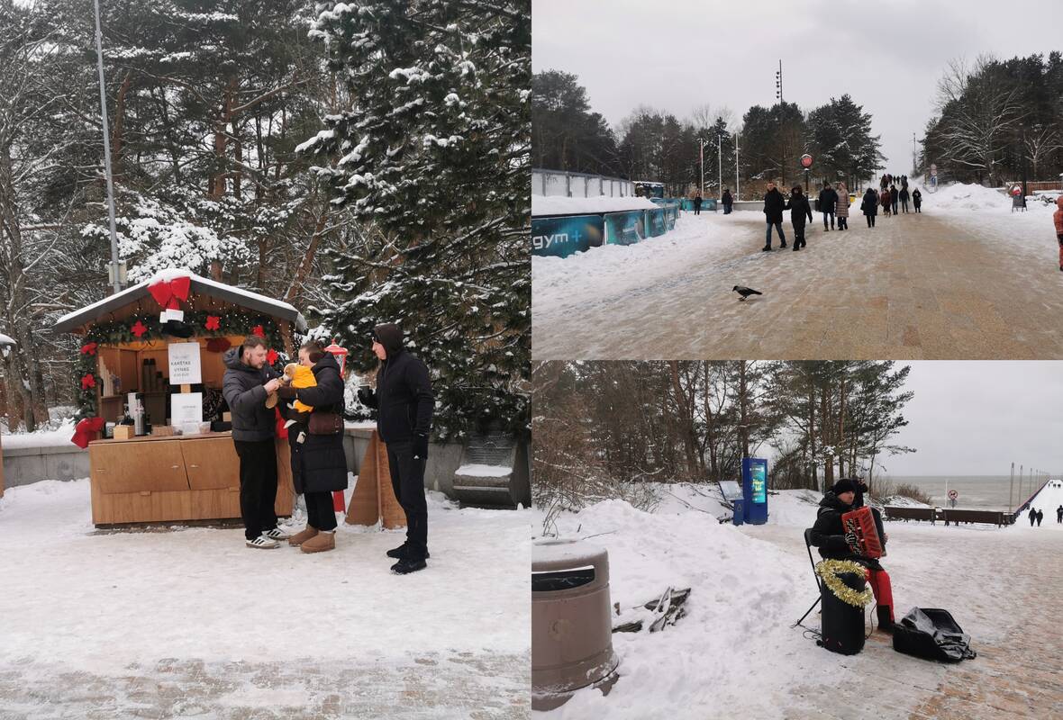Nepaisant žvarbaus vėjo, žmonės aktyviai leidžia laiką lauke, vaikšto, fotografuojasi ir stebi žiemišką pajūrio vaizdą.