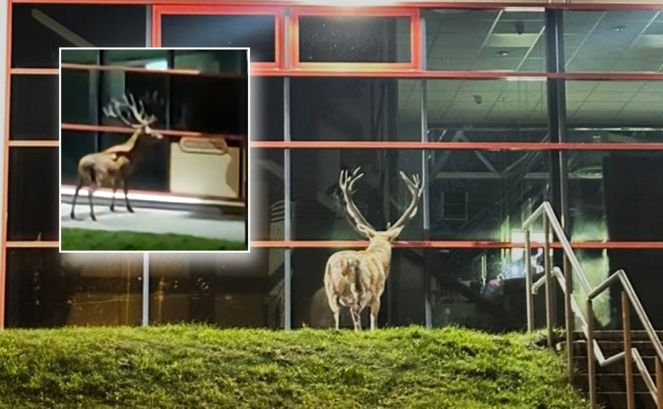 Prie parduotuvės yra veikiantys apšvietimo stulpai, tad vaizdo įraše aiškiai matyti, kaip elnias tarsi stebi save parduotuvės vitrinose.