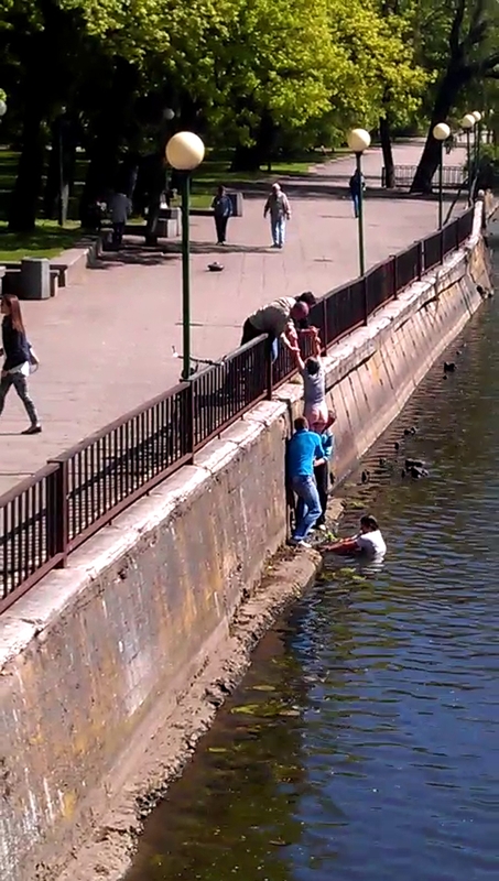 Po kelių akimirkų visiškai šlapia moteris pakilo nuo suolo ir vėl metėsi prie upės. Pakeliui ją sustabdė gelbėtojas. Pasodinta atgal ji ėmė žegnotis ir sudėjusi rankas maldai lankstytis.
