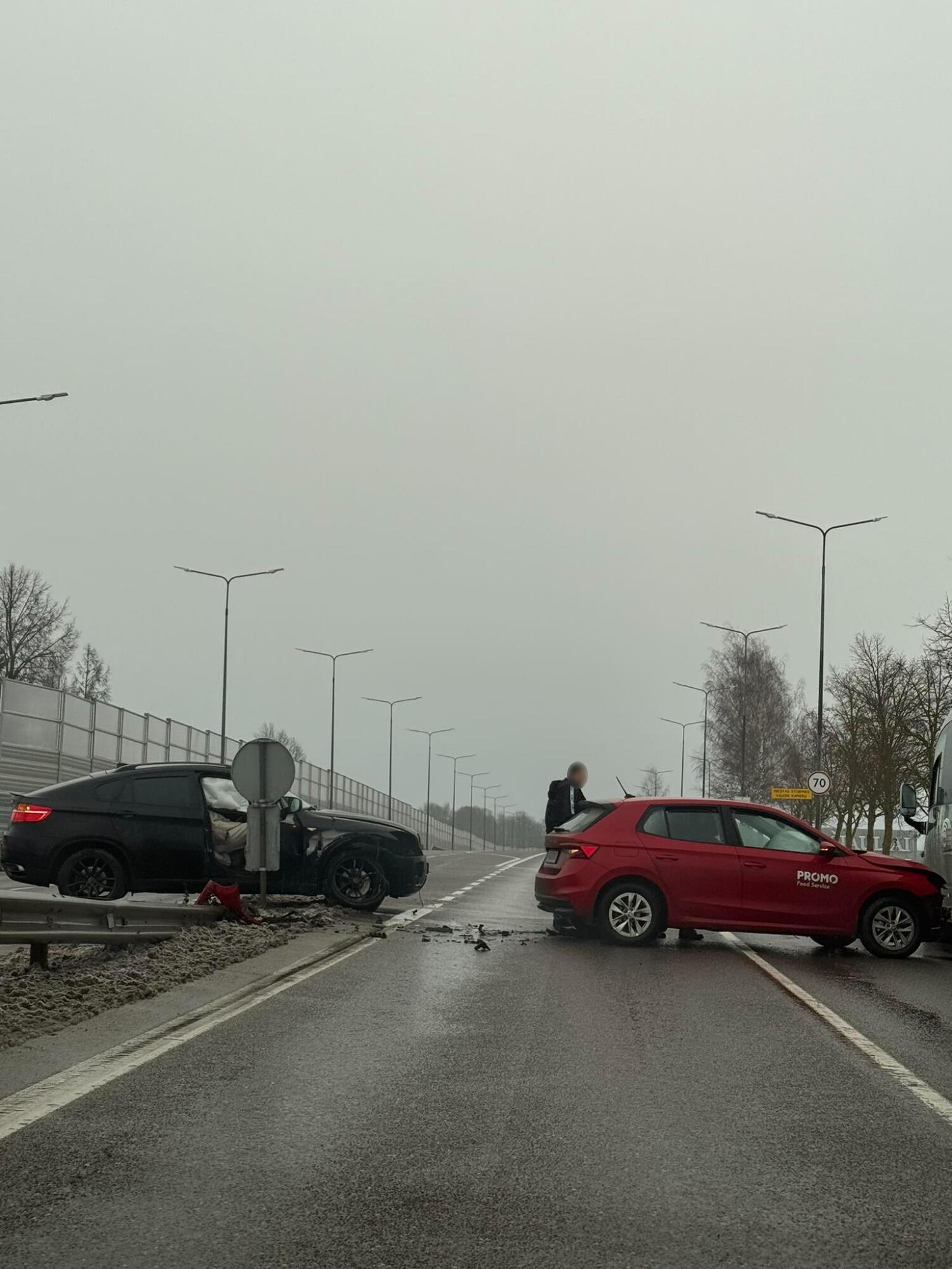 Iš avarijos vietoje darytos nuotraukos matyti du gerokai apgadinti automobiliai. Vienas jų – juodos spalvos BMW automobilis – sustojęs ties kelio atitvarais, su matomais pažeidimais priekinėje dalyje ir išsiskleidusiomis saugos oro pagalvėmis. Automobilio durys atidarytos, o šalia matosi ant žemės iškritę nuolaužų fragmentai.
