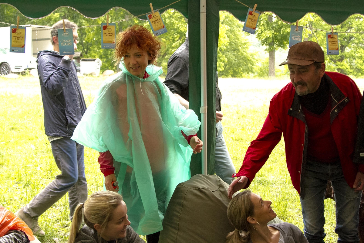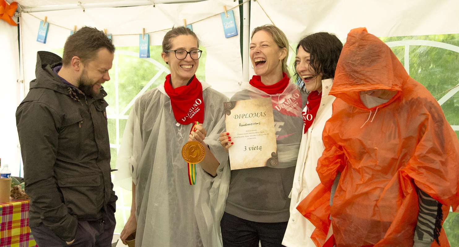 Prognozės buvo negailestingos ir išsipildė su kaupu: tą dieną, kai „Domino“ teatras organizavo orientacines varžybas savo darbuotojams, buvo numatytas lietus. Aktoriai Aušra Štukytė, Gabija Jaraminaitė, Sakalas Uždavinys, Redita Dominaitytė, Valda Bičkutė, Algirdas Dainavičius, Algis Ramanauskas ir kiti kolegos, pasipuošę lietpalčiais ir į rankas pasiėmę žemėlapius su užduotimis, leidosi į kelionę, kovodami dėl nugalėtojų vardo. Dvi su puse valandos jiems teko praleisti žingsniuojant slidžiais, bet nepaprastai vaizdingais Neries regioninio parko keliais ir, pasitelkiant žinias, išmonę ir pastabumą, spręsti ne itin lengvas užduotis.