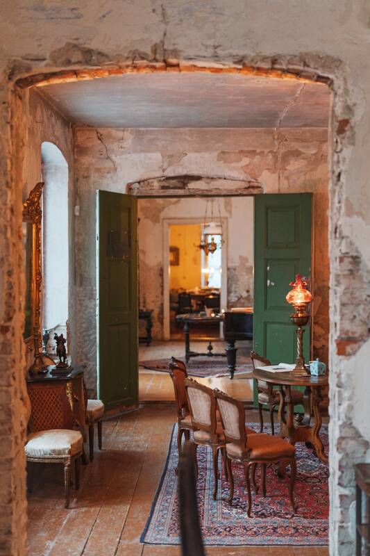 Namo viduje, kaip ir visame dvare, buvo ankstesnio turtingumo požymių, kuriuos nuo pavirtimo skarmalais ir trūnėsiais saugojo rūpestingos ir nepailstančios pastangos. Erdvioje, žemoje ir gerai apšviestoje priemenėje ant sienų kabojo tikriausiai dar prieš dešimtmečius pritvirtinti didžiuliai briedžių ir elnių ragai, o tarp jų – sausi javų vainikai, prikaišioti raudonų putinų ir šermukšnių uogų; priešais įėjimo duris esantys siauri, kitados dailūs, o šiandien tik senos politūros pėdsakų turintys laiptai vedė į viršutinę namo dalį. Iš tos priemenės dvejos atlapotos durys vedė vienoje pusėje į erdvų valgomąjį, antroje – į didelę, keturių langų svetainę. Abu šie kambariai buvo pakankamai apstatyti baldais, kurie, sprendžiant pagal jų išvaizdą ir rūšį, buvo pirkti prieš daugiau negu dvidešimt metų ir brangiai kainavo, bet dabar buvo šen bei ten neįgudusia kaimo amatininko ranka paklijuoti ir pataisyti, o brangūs audiniai, kurie kitados juos dengė, buvo pakeisti visai pigiais ir paprastais. Sienų apmušalai, kaip ir baldai, kadaise buvę brangūs ir gražūs, dabar pasenę ir nublukę, dar šen bei ten spindėjo auksuotomis puokštėmis ir arabeskomis, nemažą jų dalį dengė kelios gražios garsių paveikslų kopijos ir keliolika giminės narių portretų, įrėmintų senoviniais, sunkiais rėmais su nudilusiais paauksavimais. Grindys ten buvo vaškuotos ir spindinčios, žemos lubos baltos ir švarios, durys senovinės, sunkios, su blizgančiomis bronzinėmis rankenomis, kilimai dideli ir išblukę, svetainės kampe stovėjo gražus fortepijonas, šalia langų skoningai išdėstyti žali augalai. Aiškiai buvo matyti, kad per dvidešimt metų čia nieko nepadaugėjo, bet ir nieko neišnyko, o tai, ką purvino, laužė ir niokojo laikas, kažkas nuolat valė, siuvo ir taisė. Tai sudarė įspūdį, kad čia nuolat vyksta darbas, stengiantis sulėtinti, gal visai sustabdyti laipsnišką, bet nepermaldaujamą procesą, kuris turtingumą paverčia skurdu.