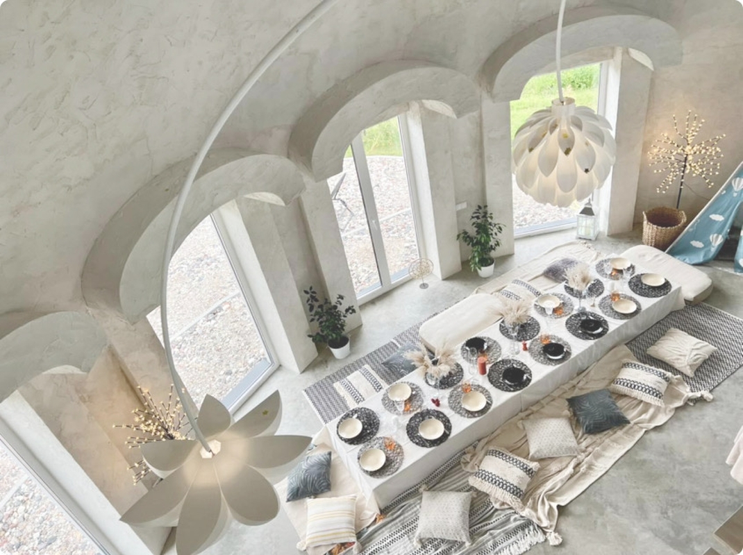 Statybos inžinierė čia kuria interjerus ne tik kupoliniams namams, bet ir tiems, kurių savininkai pageidauja įdomesnių ir netradicinių sprendimų, Žiedūnės pamėgtų apvalių formų.
