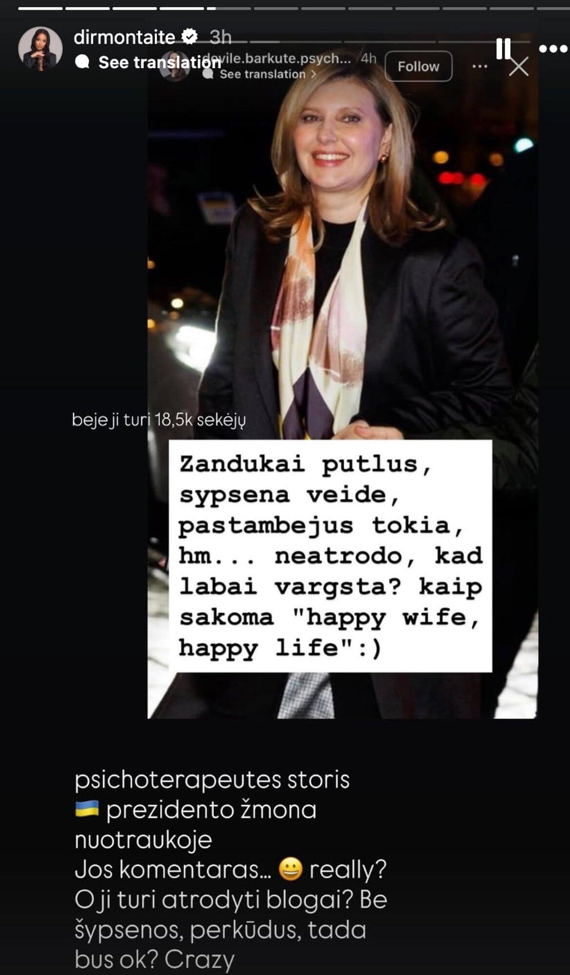 Marketingo specialistė Aurelija Dirmontaitė savo socialiniame tinkle „Instagram“ rašė: „Psichoterapeutės storis. Prezidento žmona nuotraukoje. Jos komentaras... Really? O ji turi atrodyti blogai? Be šypsenos, perkūdus, tada bus ok? Crazy.“