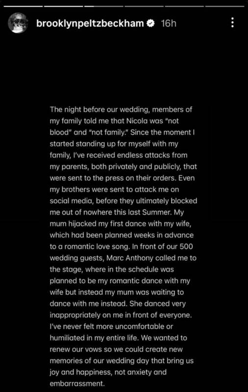 Brooklyn taip pat teigė, kad jo mama per vestuves perėmė jų pirmąjį šokį, kai vietoje Nicolos į sceną išėjo pati ir, pasak jo, „elgėsi netinkamai visų akivaizdoje“.
