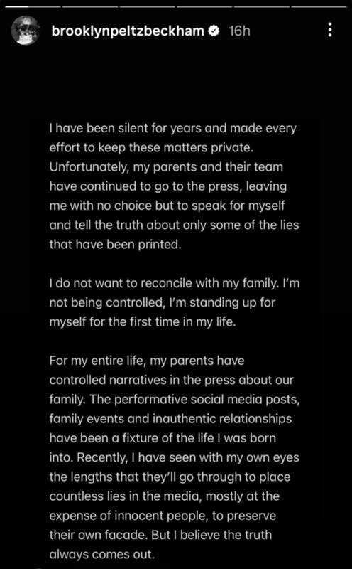 „Ilgus metus tylėjau ir dariau viską, kad šie reikalai liktų privatūs. Deja, mano tėvai ir jų komanda toliau kreipėsi į spaudą, todėl nebeturėjau kitos išeities, kaip tik prabilti ir pasakyti tiesą apie bent dalį viešai paskelbtų melų“, – rašė Brooklynas.