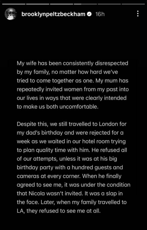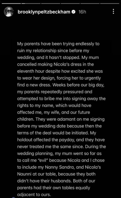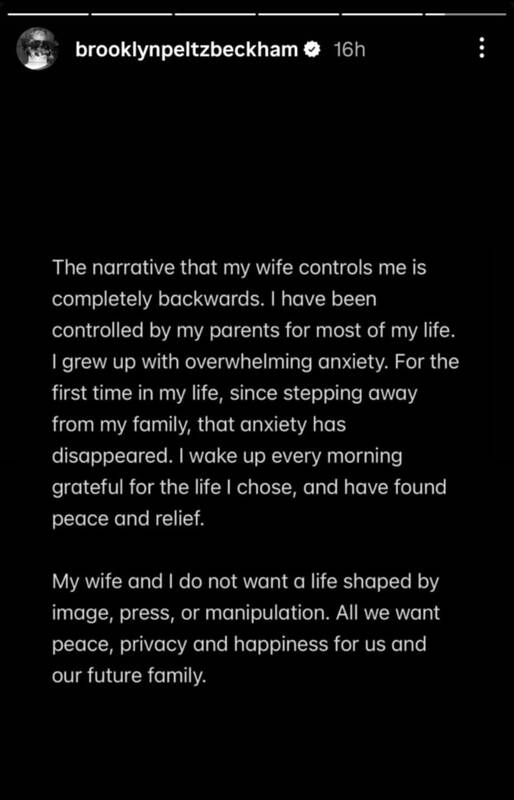 Jis taip pat apkaltino tėvus ir jų aplinką bandymais per žiniasklaidą pakenkti jo santuokai su žmona Nicola Peltz Beckham – amerikiečių aktore ir milijardieriaus Nelsono Peltzo dukra.