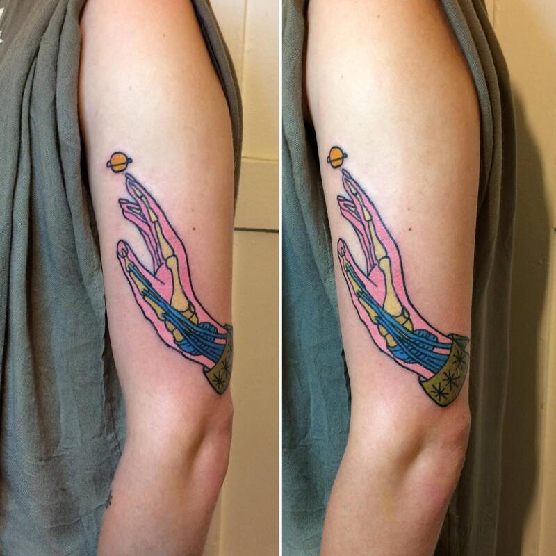 "Važiavau ją darytis į saloną Šiauliuose "Totemas", pas meistrą Aivarą Ly. Dabar pagalvoju, kad pati tatuiruotė, kaip pirmam kartui, buvo per masyvi, seansas truko šešias valandas, tatuiruotė dengė ranką nuo alkūnės iki peties. Grįžus namo į Kauną buvo pakilusi temperatūra, purtė šaltis. Pamenu, kad tuo metu pagalvojau, jog daugiau niekada gyvenime nesidarysiu tatuiruočių, bet gyvenimas pasisuko visiškai kita linkme", – pasakojo tatuiruotojas.