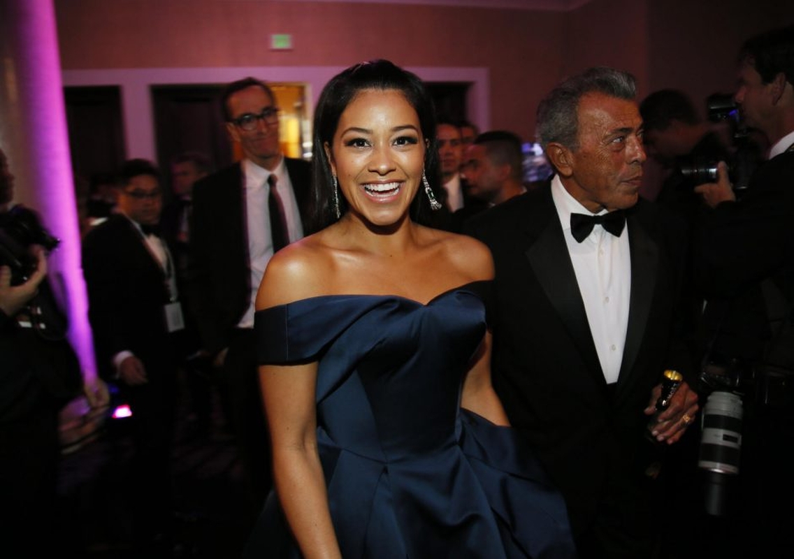 Gina Rodriguez (Džina Rodriges), kuri už darbą seriale „Jane the Virgin“ pernai laimėjo „Auksinį gaublį“ kaip geriausia komedijos aktorė ir kuri šiemet vėl buvo nominuota, skleidė energiją su safyro mėlio suknia be petnešėlių, kurią sukūrė Zacas Posenas (Zakas Posenas), be to, turėjo puikų aksesuarą – savo tėtį.