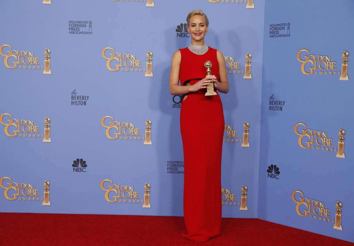 Jennifer Lawrence (Dženifer Lorens), kuri už darbą „Džojoje“ (Joy) buvo pagerbta kaip geriausia komedijos aktorė, padarė įspūdį su aiškios struktūros, kolonos formos raudona suknia iš „Dior“, kuri dėl prakirpimų šonuose parodė ir šiek tiek nuogo kūno.