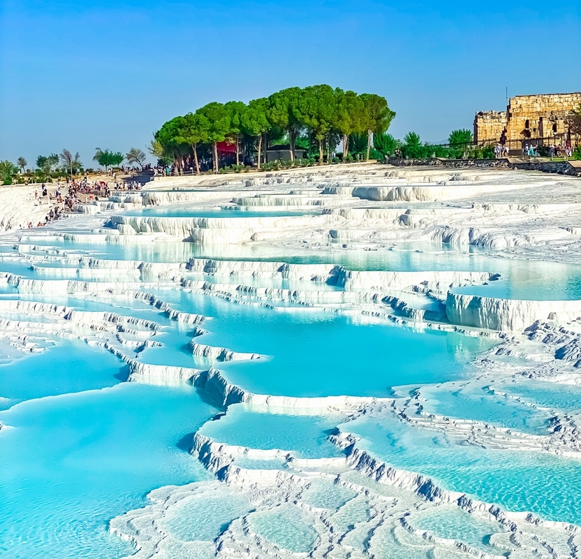 Pamukalė: iš žemės gelmių čia trykštantys terminiai šaltiniai, tekėdami kalno šlaitu, suformavo sniego baltumo travertino terasas, kurias žmonės praminė Medvilnės pilimi. / wikimedia.com, freepik.com nuotr.