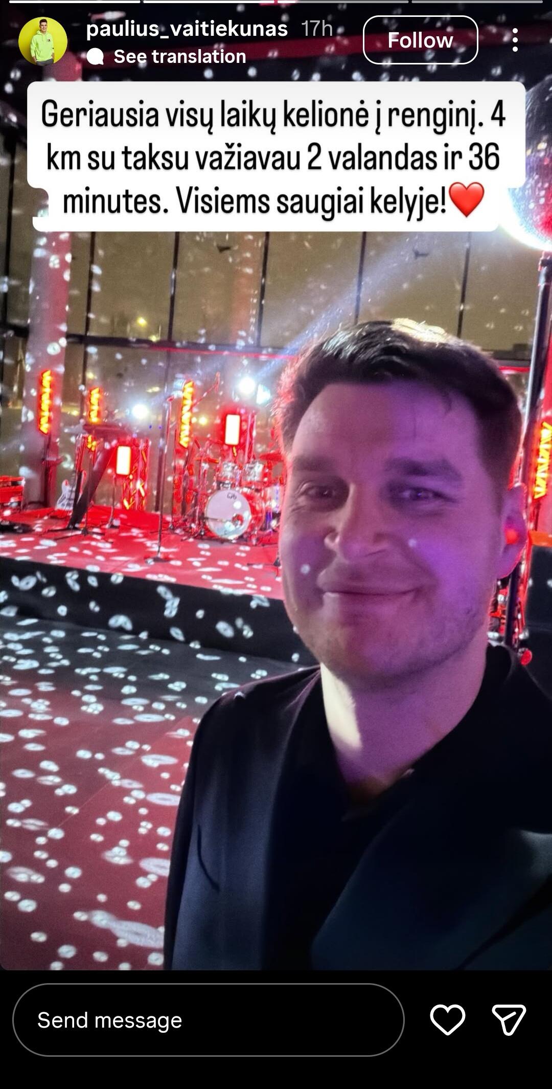„Geriausia visų laikų kelionė į renginį. Keturis kilometrus su taksi važiavau 2 valandas ir 36 minutes. Visiems saugumo kelyje!“ – įspūdžiais dalijosi jis.