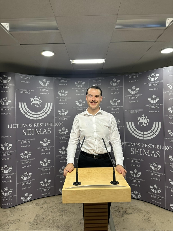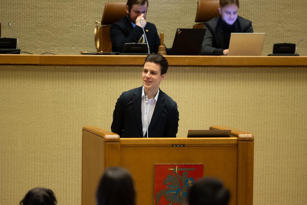 Nuotraukoje – Laurynas Vilkas sako kalbą iš Seimo istorinės salės tribūnos. Kas žino, gal ją prisimatavo Lietuvos liberalaus jaunimo konferencijoje, o netrukus iš jos galės kalbėti jau ne kaip Seimo svečias. Laurynas – jauniausias kandidatas į parlamentą spalį vyksiančiuose rinkimuose. Minimalią kandidatui 21 metų kartelę kaunietis peržengs prasidėjus išankstiniam balsavimui. Rinkimų dieną jam bus 21 metai ir penkios dienos.